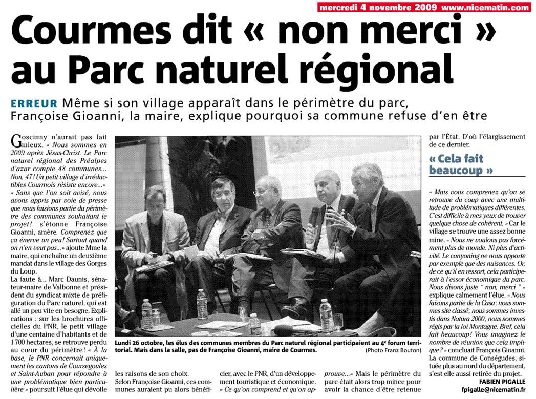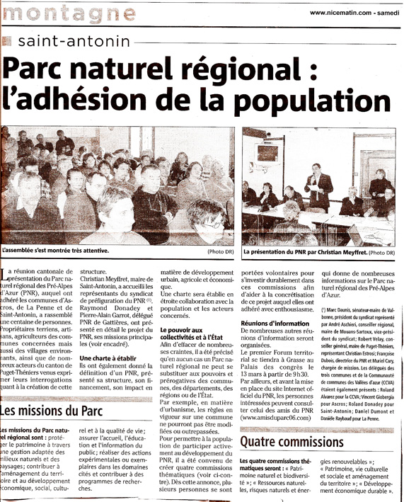 Élaboration de la concertation, rédaction de la charte du Parc naturel régional et appui stratégique et méthodologique. Doc. Power-point Ecouter l'interview sur les Amis du parc réalisé lors de l'éco-festival de Saint-Jeannet du 3/4/5 juillet 2009 par : "Radio Ethic" 4eme Forum territorial Article de Nice matin du 22 10 09 M. Vauzelle apporte son soutien de la région devant les maires du PNR |