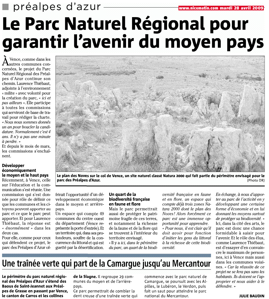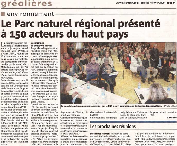 | Archives Parc Naturel Régional Préalpes d'Azur: Août 2004 Etude de préfiguration du Parc Naturel Régional des Préalpes d’Azur par CRP consulting Biotope Août 2004 format Pdf (9Mo) Avril 2006 Fin 2008 janvier, 2009 13/01/09 à St Vallier 31/01/2009 Article de Nice matin sur la 1er réunion cantonale à Gréoliere du Télécharger le document 7/02/09 Réunion cantonale à Andon - Télécharger et Lire Nice-Matin 14/02/09 à st Antonin Réunion cantonale - Enregistre audio: Trame Verte et Bleue "les suites du Grenelle de l'environnement." Lire le document 20/02/09 à Carros Réunion cantonale - Télécharger le compte-rendu 27/02/09 à Vence Réunion cantonal Lire le compte-rendu 5/03/09 St Vallier Réunion cantonal 6/03/09 à Gilette Réunion cantonal 2eme série de commissions thématiques du vendredi 17 avril Commission 4 : Développement économique durable à Carros Commission 2 : Ressources naturelles, risques naturels et énergies