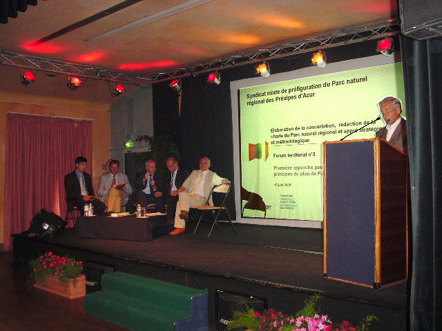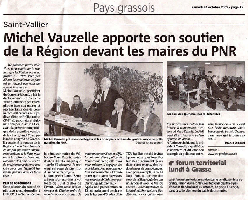 Élaboration de la concertation, rédaction de la charte du Parc naturel régional et appui stratégique et méthodologique. Doc. Power-point Ecouter l'interview sur les Amis du parc réalisé lors de l'éco-festival de Saint-Jeannet du 3/4/5 juillet 2009 par : "Radio Ethic" 4eme Forum territorial Article de Nice matin du 22 10 09 M. Vauzelle apporte son soutien de la région devant les maires du PNR |